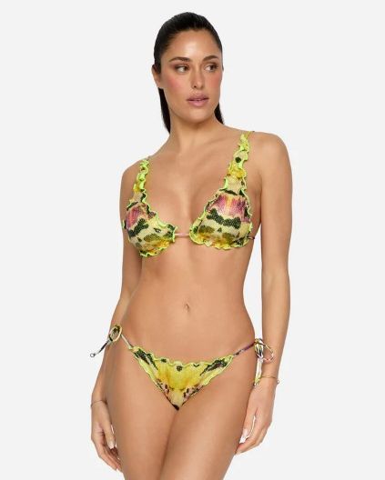 Bikini triangolo alto con slip brasiliano regolabile in tessuto Lycra rivestito con paillettes arricciato sui bordi. Capo dotato di imbottitura interna estraibile.