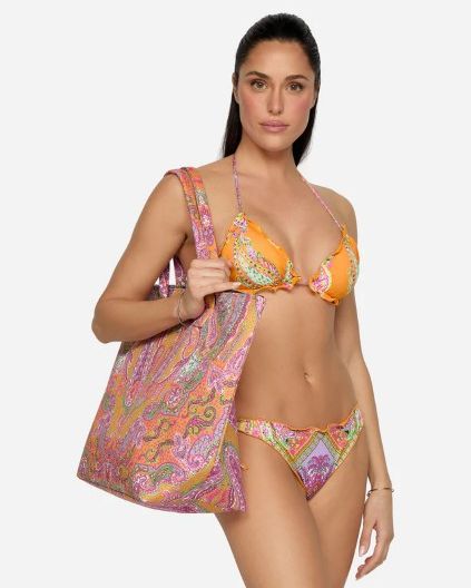 Bikini triangolo con slip nodi Brasiliano regolabile in tessuto Lycra a fantasia, arricciato sui bordi. Capo dotato di imbottitura interna estraibile.