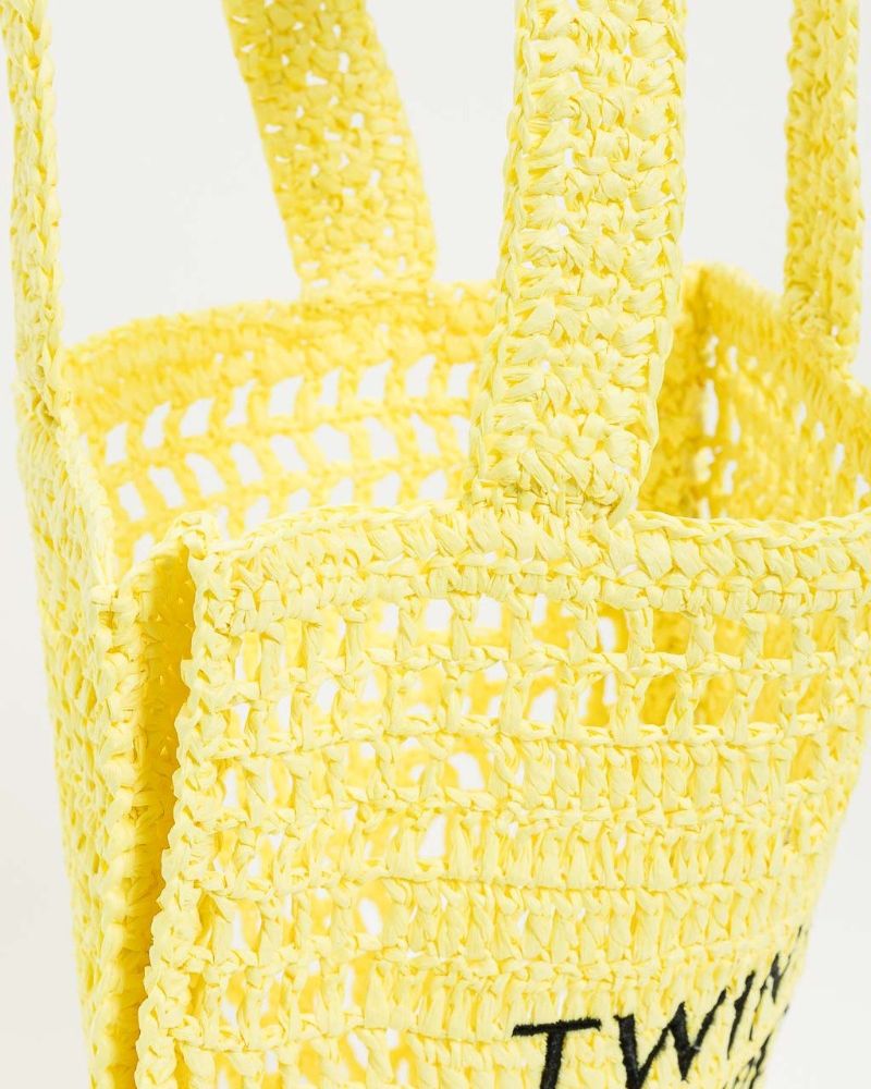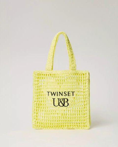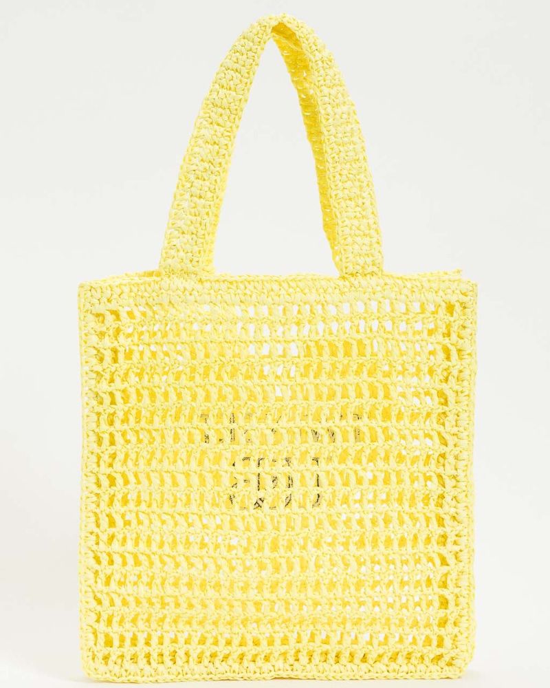 Borsa shopper effetto paglia intrecciata, con manici, ricamo a cuore, ricamo logo a contrasto.