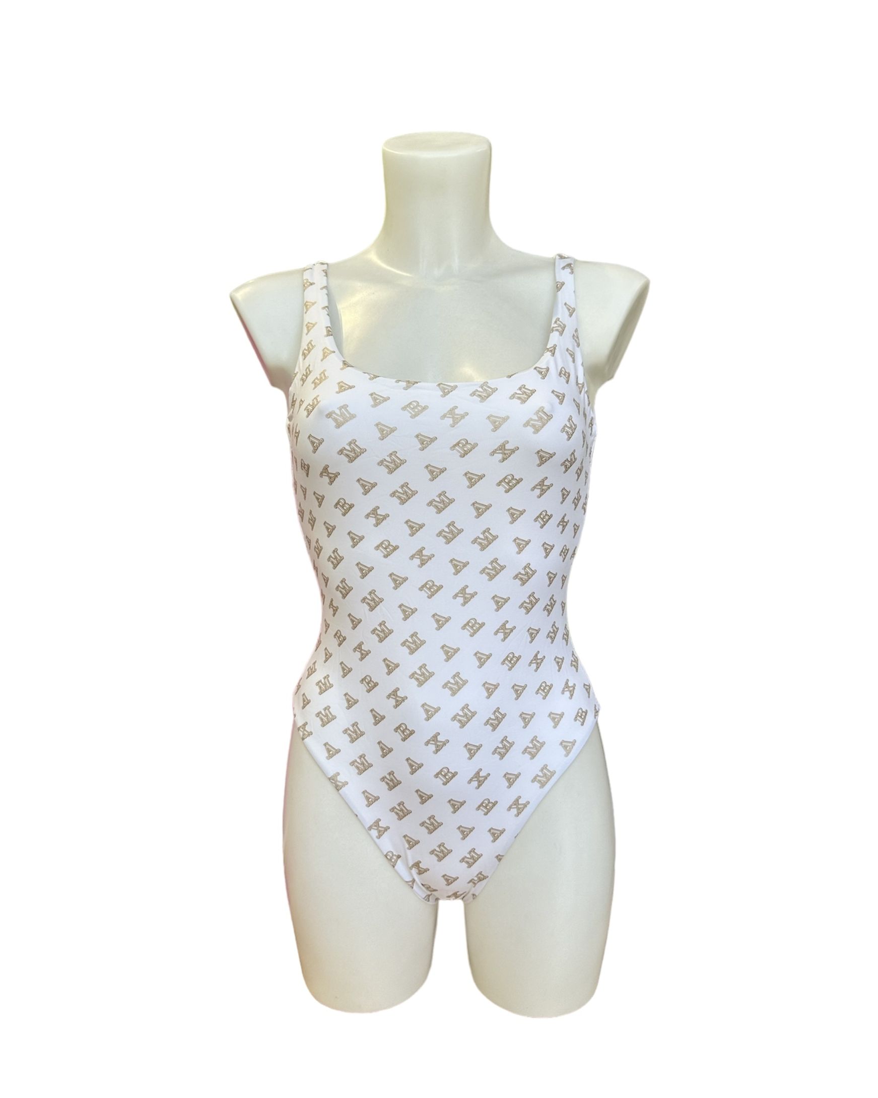 Il modello presenta un generoso scollo tondo sul retro con medaglietta logata color oro in una particolare lega resistente al cloro, al sale e alle creme solari.