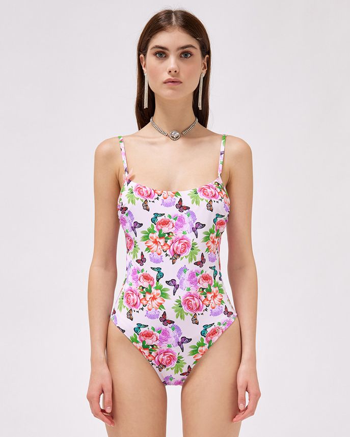 UNA FARFALLA DÉCOR IN ORGANZA RIFINISCE LA SPALLINA DEL COSTUME INTERO STAMPATO CON FERRETTO, SENZA IMBOTTITURA.