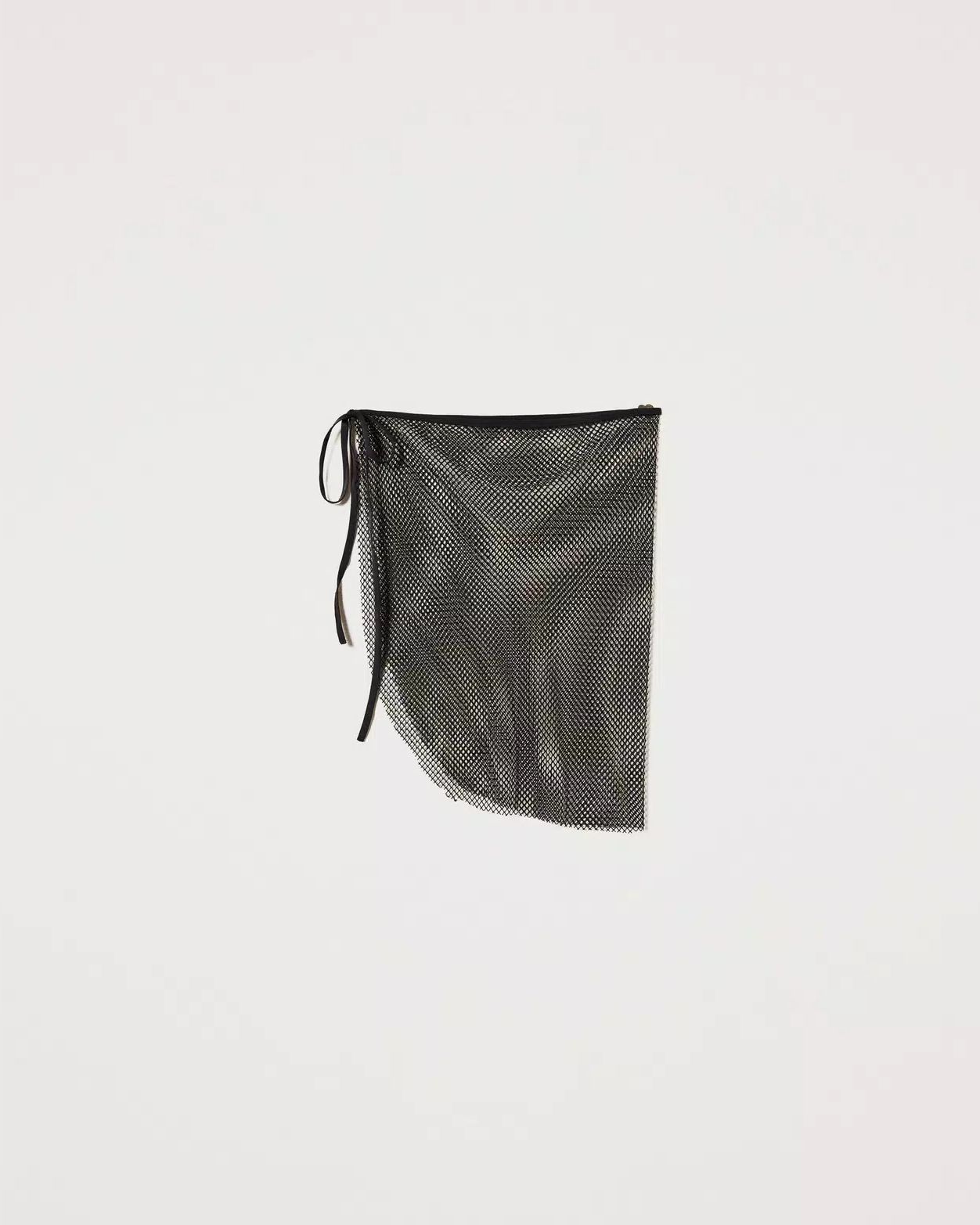 Gonna pareo in rete con strass all over, chiusura in vita con cordone da annodare.